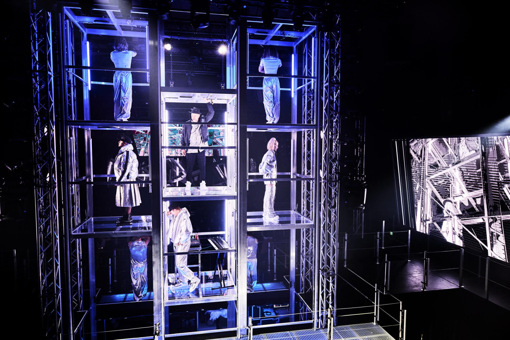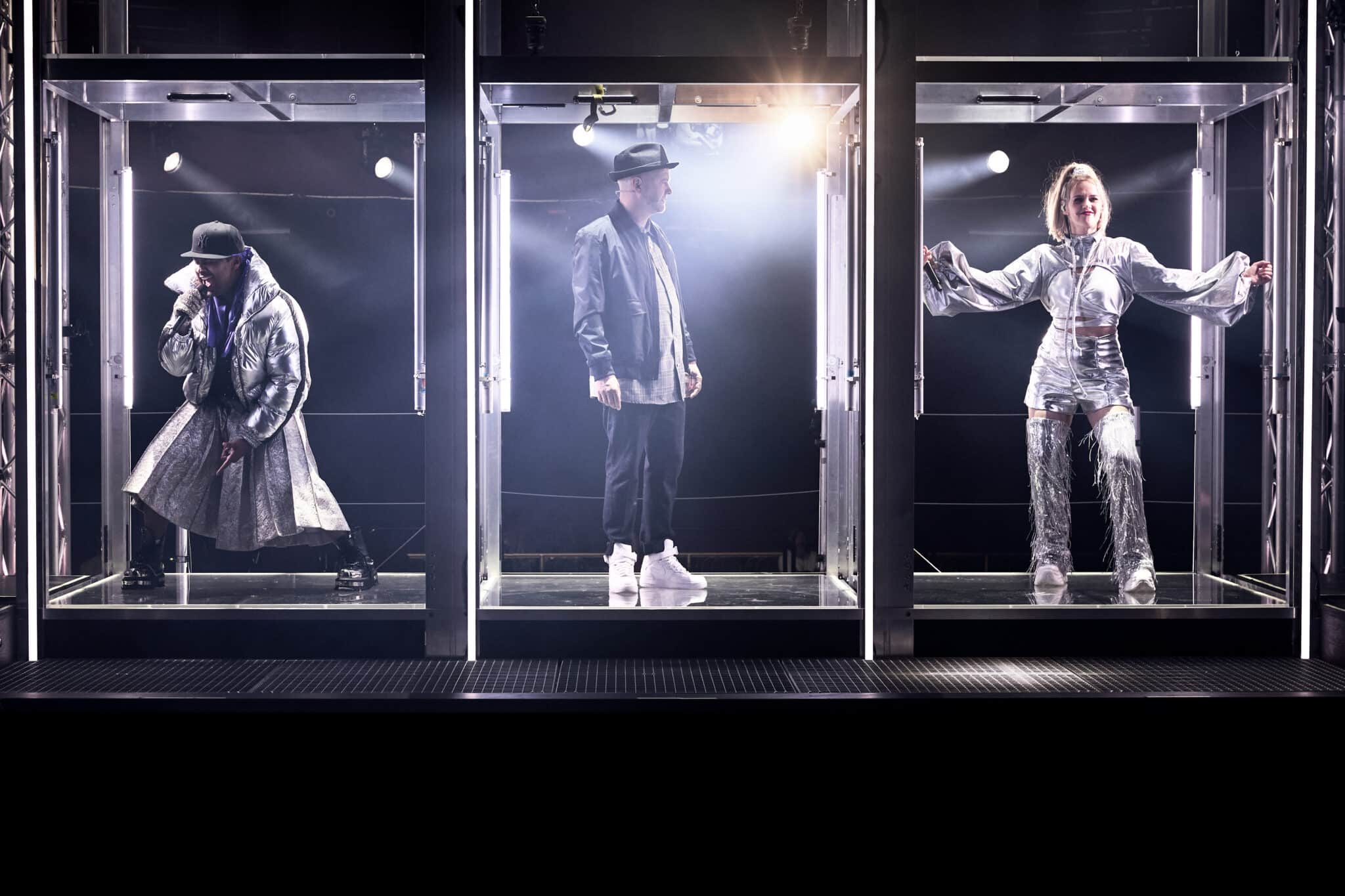 Tre gennemsigtige elevatorer er det centrale i Eilev Skinnarmos scenografi. Der er publikum på begge sider.