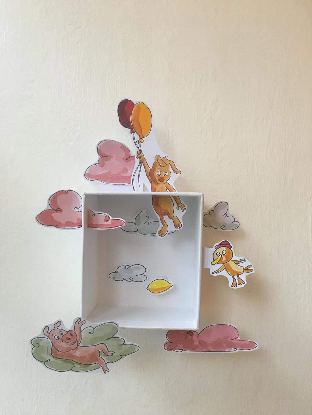 Udstillingen har navnet “Bananmand til vejrs” og består af en række æsker, hvori der i hver enkelt udspiller sig små fortællinger. Det er tegninger og udklip. De 30 værker, der hænger på Oscar nu, er lavet af karton og akvarel, og er alle unikke.